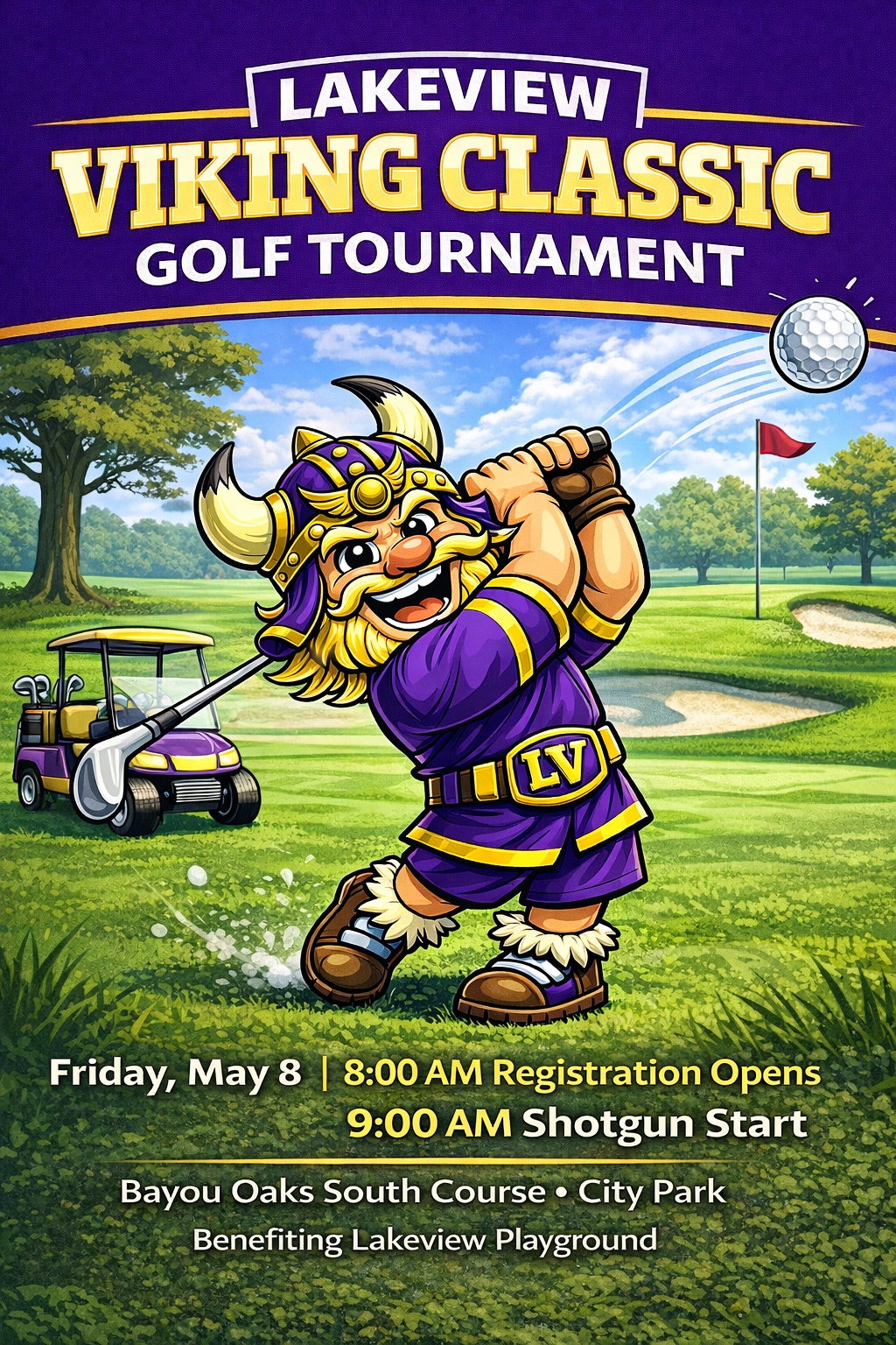 The Lakeview Vikings are proud to host our upcoming Viking Classic Golf Tournament at Bayou Oaks South Course, a fun-filled day of golf, food, and community in support of Lakeview Playground.